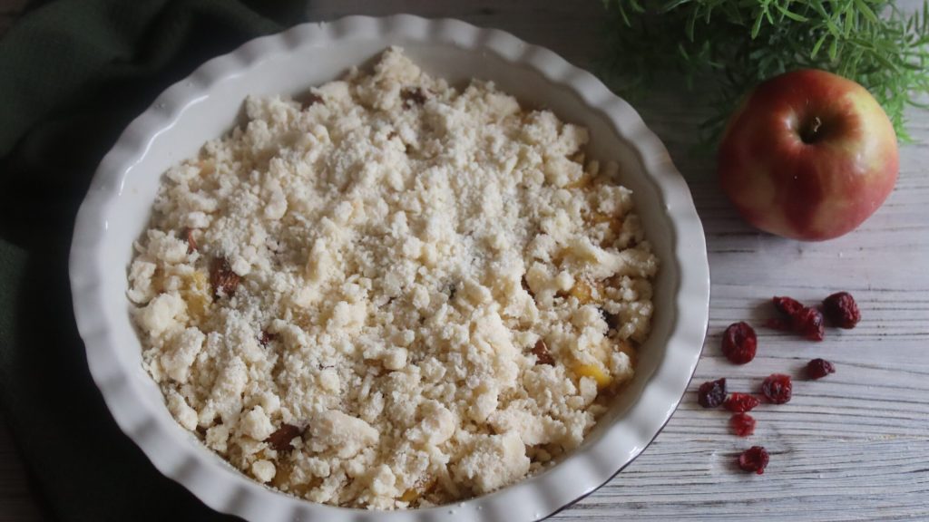Parsemez les miettes de pâte sablée sur les pommes dans le plat à gratin.