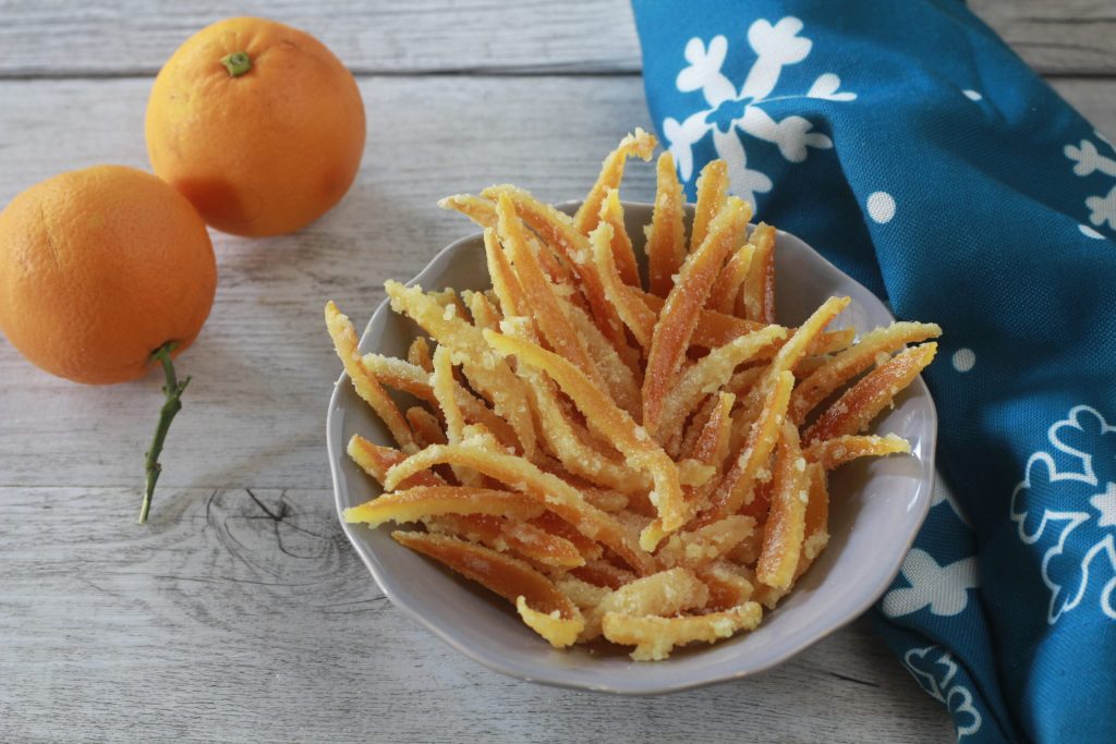 Écorces d’orange confites, c’est la bonne saison. Bien sûr, il faut des oranges biologiques, car nous utilisons exactement les zestes d’orange. Cette recette convient aussi pour les citrons, les cédrats et autres agrumes. Les écorces d’orange confites sont vraiment faciles à préparer et encore plus faciles à consommer et à intégrer dans des recettes comme les muffins à la farine de riz sans gluten. Mais vous saurez sûrement comment les utiliser. Sympa aussi comme idée cadeau pour des amis pendant la période de Noël, ou plongées dans du chocolat fondu, qu’il soit noir ou blanc. Une fois sèches, elles se conservent jusqu’à six mois dans un bocal hermétique — si vous y arrivez : chez moi elles durent de Noël au 26 décembre, un classique. Cette façon de confire les écorces d’orange fait toujours partie de ma manière de cuisiner : on ne jette rien.