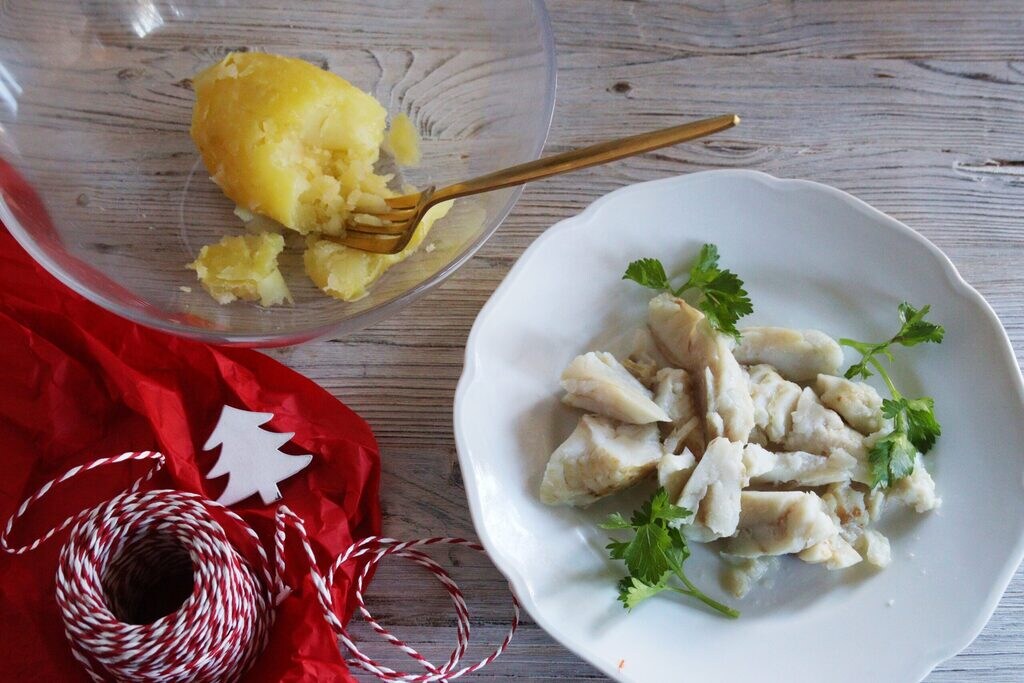 Dans un bol, écrasez avec la fourchette les pommes de terre avec le cabillaud cuits,