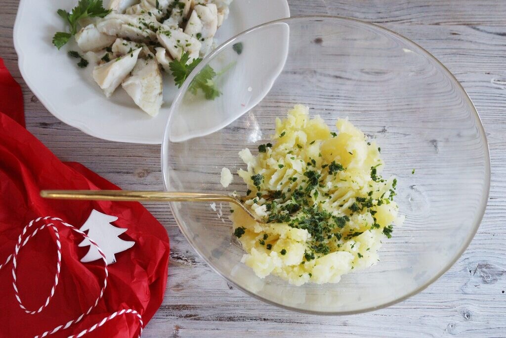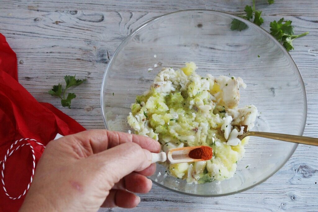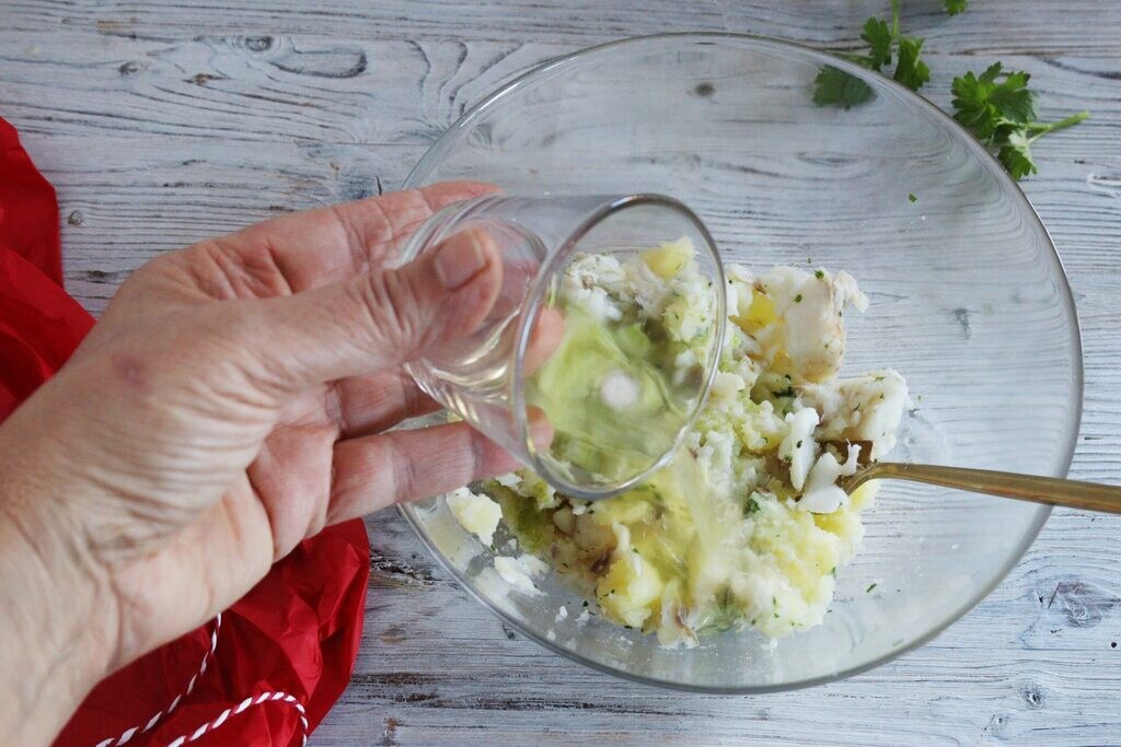 Dans un bol, écrasez avec la fourchette les pommes de terre avec le cabillaud cuits,