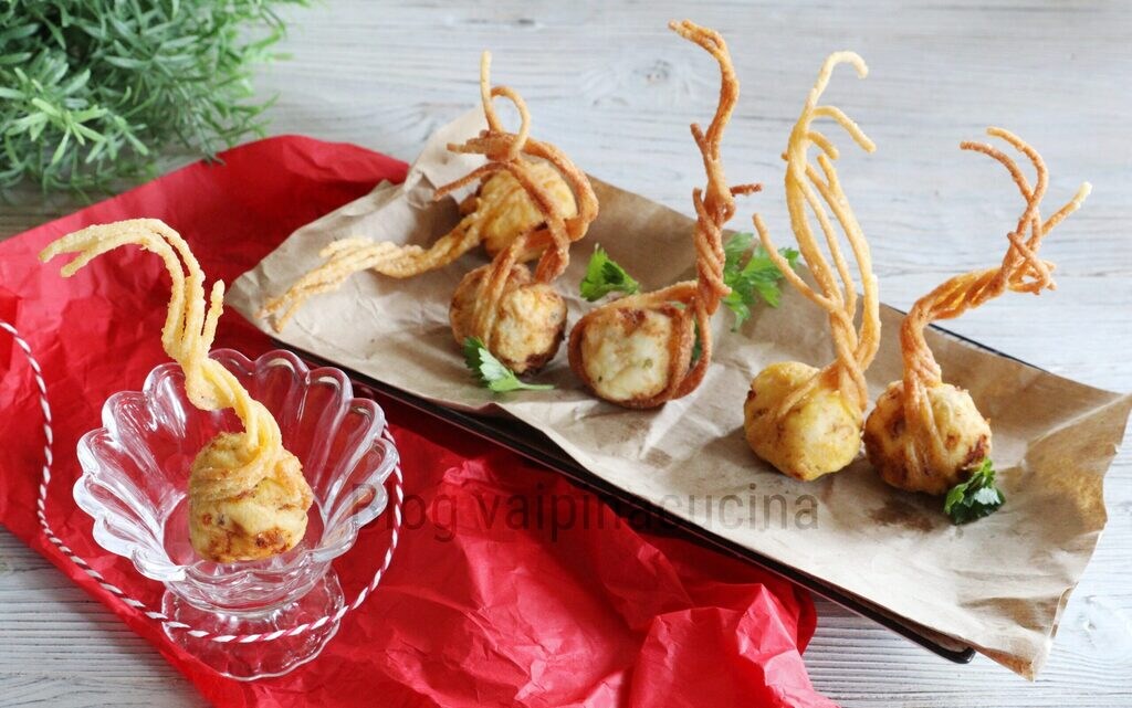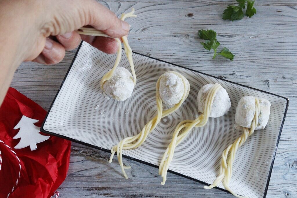 Enroulez 3 spaghetti autour des boulettes de poisson