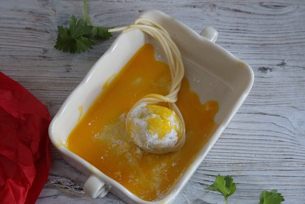 Faites cuire les spaghetti, égouttez-les à mi-cuisson et laissez-les refroidir. Passez les boulettes de poisson dans la farine puis dans le jaune d’œuf mis de côté.