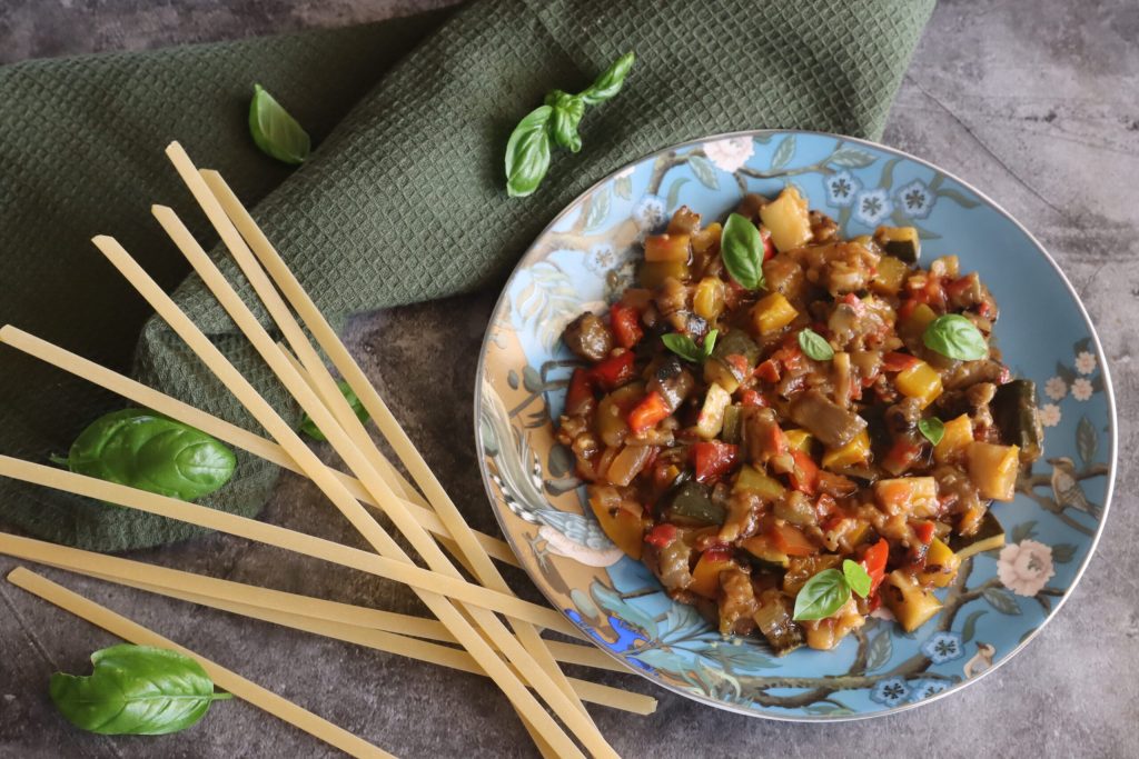Fettuccine et légumes d’été, préparées avec de la farine de blé dur et de l’eau simplement. Les légumes sont cuits à la poêle et mijotés. Les légumes d’été, comme les aubergines, les courgettes, les tomates et les poivrons, sont un accompagnement typique de la cuisine rurale italienne, surtout du Sud. Même si les légumes d’été ne sont pas seulement ceux-ci, c’est évident. Nous parlons d’un plat authentique et sain, qui se prépare en mettant tous les légumes à cuire à la poêle pour mijoter. L’oignon et le basilic, naturellement, ne peuvent pas manquer dans ce plat. Ce plat est idéal pour accompagner un plat principal, mais aujourd’hui je l’utiliserai comme sauce pour mes fettuccine eau et farine, simples.