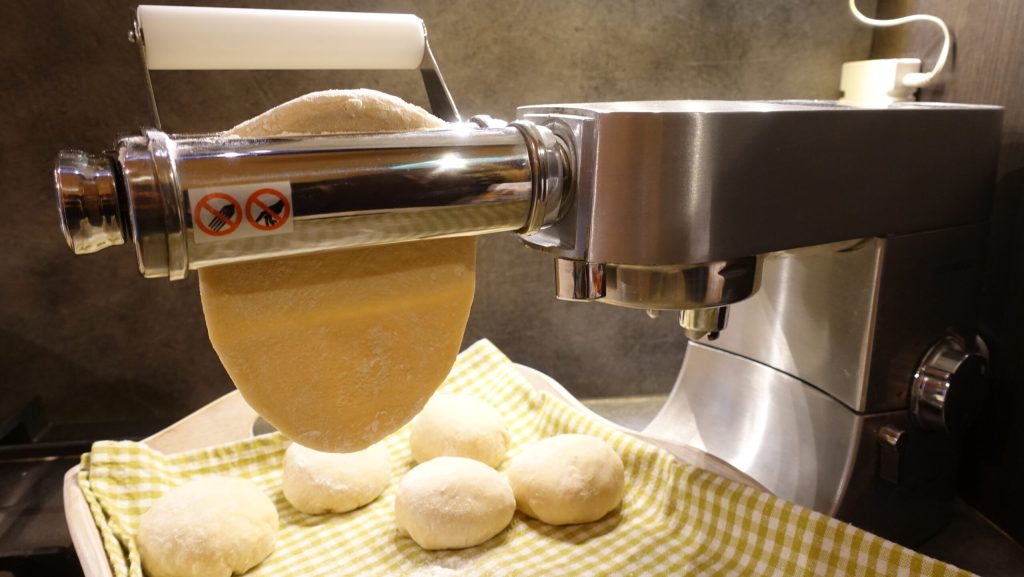 Après avoir passé les pâtons dans la machine à pâtes et transformés en feuille de l’épaisseur préférée, changez la machine à pâtes et mettez la découpeuse à fettuccine.
