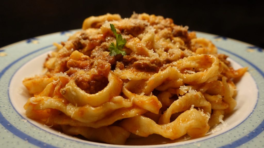 Fettuccine maison au ragù comme autrefois, comme les préparait ma maman le dimanche matin avec la farine de blé dur, lorsque nous n’allions pas déjeuner chez mamie Giovanna, au village voisin à seulement 35 kilomètres de distance. Pour préparer les fettuccine aux œufs avec la farine de blé dur maison, cela ne prend pas beaucoup de temps, surtout parce qu’aujourd’hui la technologie nous offre des outils de plus en plus efficaces qui nous aident à la maison, comme le robot culinaire, la machine à pâtes ou la découpeuse à fettuccine. Ma grand-mère préparait à la main les fettuccine et le ragù cuit avec le four à bois, autrefois on cuisinait comme ça, ma grand-mère avait aussi la cuisine à gaz mais elle préférait encore cuisiner au bois parce qu’elle disait que c’était meilleur. Je vous dis la vérité, j’étais petite et je me souviens que tout était délicieux.