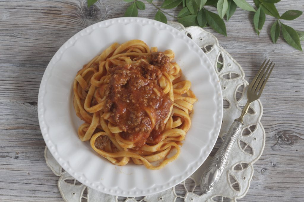 Assaisonnez les fettuccine maison au ragù de viande, avec du parmesan en abondance.