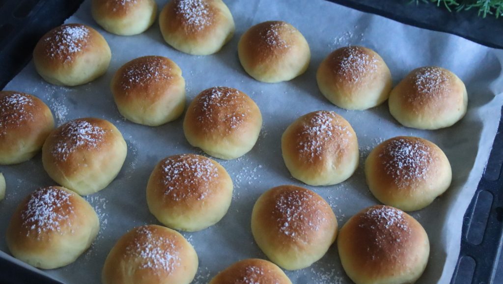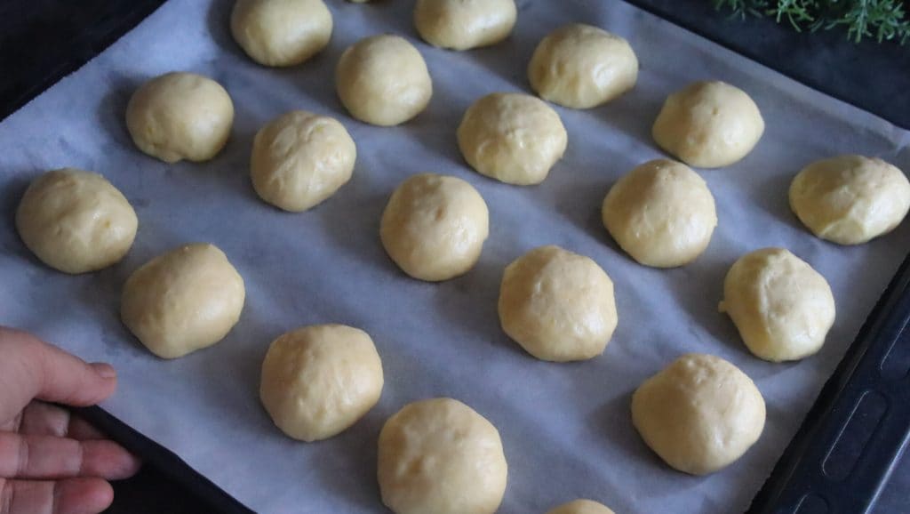 Reprenez la pâte après le temps de levée, passez un morceau de beurre sur le plan de travail et commencez à préparer les petits pains de 20 grammes chacun. J’en ai fait 30.