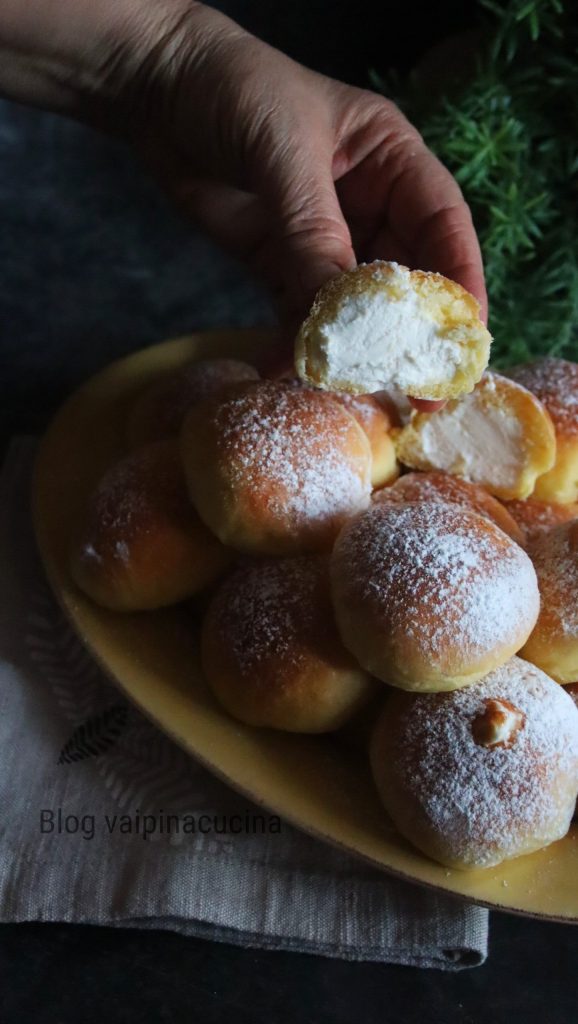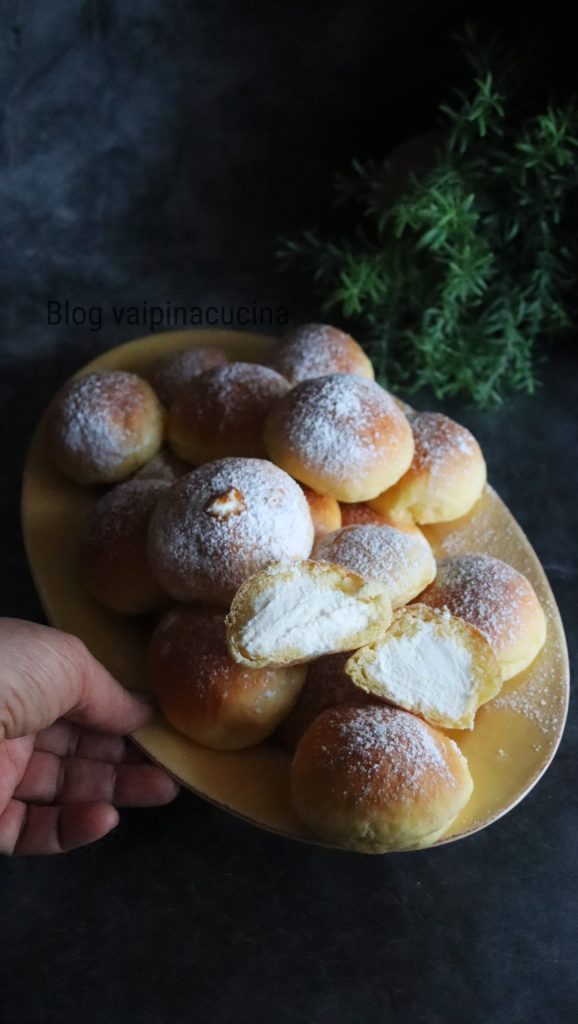 Flocons de neige recette facile et création originale de la pâtisserie Poppella dans le quartier de la Santé à Naples, fondée en 1920. Un dessert typique de la cuisine napolitaine, particulièrement moelleux, qui ressemble à un flocon de neige, garni d’une crème de lait et ricotta. Je dois être honnête, ce dessert particulier et délicieux demande beaucoup de patience et de temps : il faut plusieurs heures de levée et puis, une fois que la pâte a triplé, après avoir préparé les petits pains, il faut les laisser reposer encore une heure. Mais en tant que grande gourmande que je suis, je ne pouvais pas manquer dans mon répertoire de desserts une recette aussi simple mais d’une bonté unique.