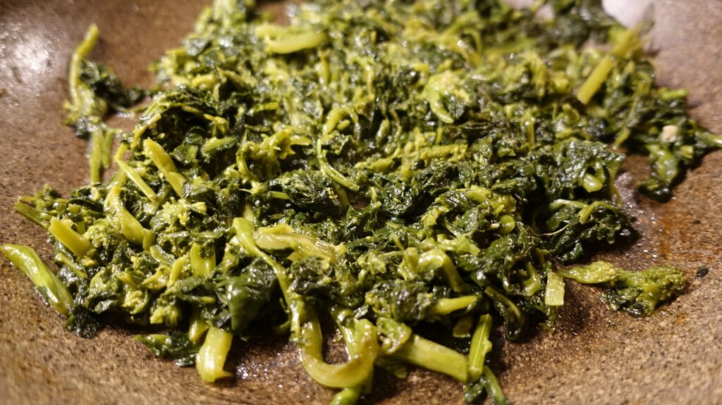 Dans une poêle avec trois cuillères à soupe d’huile d’olive extra vierge, faites légèrement rissoler l’ail et le piment, ajoutez les petits brocolis et faites cuire à couvert pendant vingt minutes en les retournant souvent.
