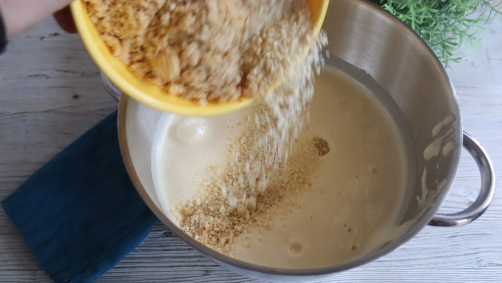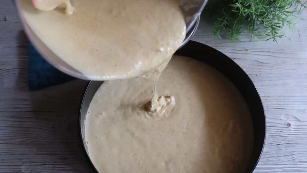 • Versez le mélange dans le moule. Le mien est à charnière et j’ai mis du papier sulfurisé au fond.