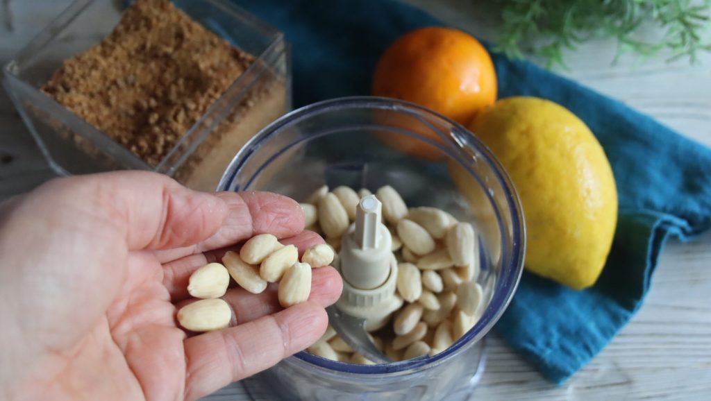 • Mettez 250 g d’amandes dans le hachoir et hachez-les très finement, en poudre, les autres 50 g hachez-les grossièrement.