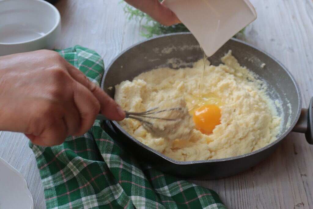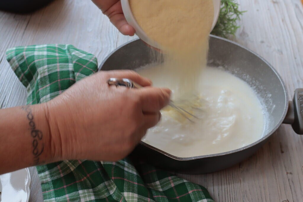 Dès que cela commence à bouillir, versez la semoule en pluie et remuez énergiquement avec le fouet pour éviter la formation de grumeaux.