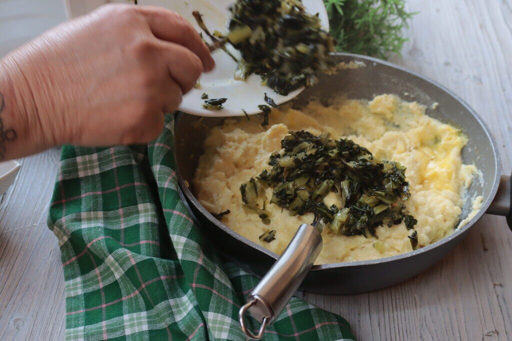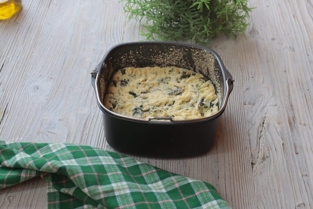 Gâteau de semoule aux légumes et précisément la chicorée ou plutôt les feuilles extérieures des «puntarelle», celles qui sont utilisées dans le centre-sud pour les salades. Facile et simple à préparer et ensuite cuit dans une friteuse à air en quelques minutes le gâteau de semoule est idéal pour un plat principal rapide et savoureux. Pour ne pas jeter les feuilles extérieures, qui entourent les «puntarelle», nous les cuisinons même sans les faire bouillir d’abord car elles sont tellement tendres.