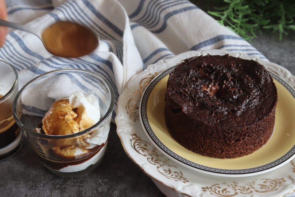 • Versez la crème sur le gâteau en tasse et bon petit-déjeuner.