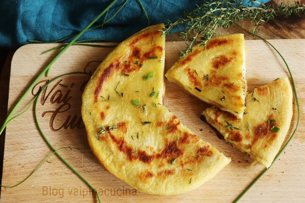 En alternative aux petites galettes individuelles, je vous propose également de faire une grande galette farcie au lieu de quatre petites. Les mêmes ingrédients, la même procédure, nous faisons cuire les pommes de terre (après les avoir piquées avec une fourchette) au micro-ondes dans un bol en verre fermé avec du film alimentaire pendant 15 minutes, dès qu’elles sont prêtes, nous les épluchons et les passons au presse-purée, sinon un moulin à légumes convient aussi. Ajoutez l’huile avec la muscade, le sel et la farine et divisez le mélange en 4 parties si vous souhaitez préparer quatre portions individuelles, sinon dans un moule avec du papier cuisson, mettez la moitié du mélange de pommes de terre assaisonnées, répartissez la provola fumée dessus et refermez avec l’autre moitié du mélange restant. Fermez bien les bords pour éviter que la provola ne s’échappe pendant la cuisson, arrosez d’huile et d’herbes fraîches comme le thym et la ciboulette, et faites cuire à la poêle ou sur une plaque déjà chaude pendant 7 minutes de chaque côté.