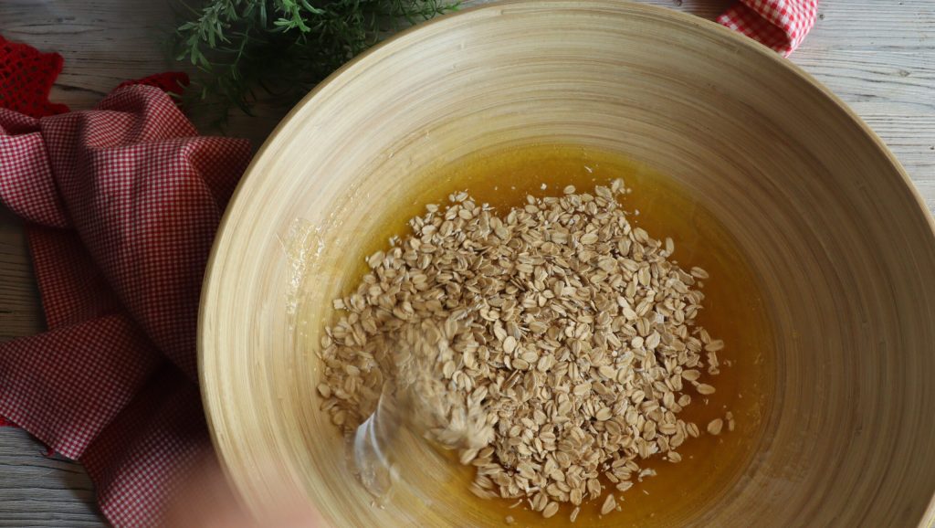 Ajoutez les flocons d’avoine avec les amandes et noisettes hachées.