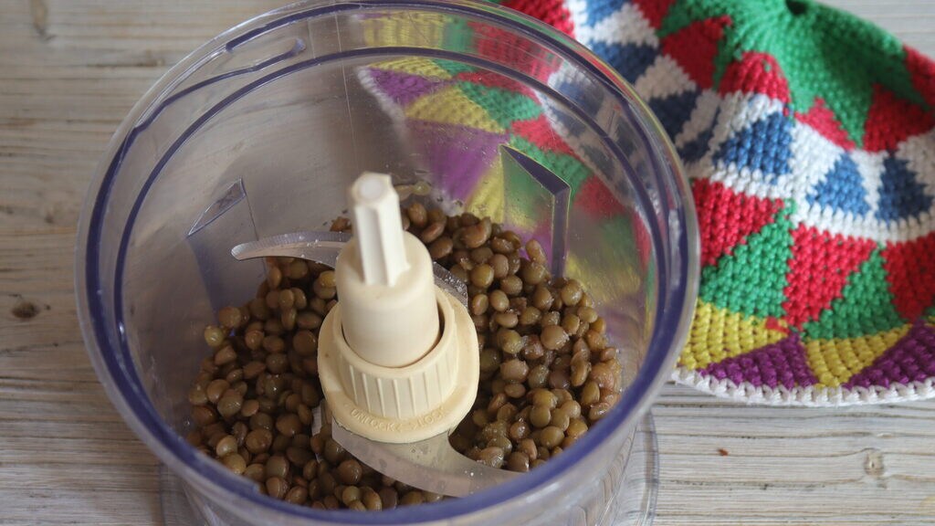 Je mets les lentilles dans le hachoir avec l’ail écrasé, les arachides et les tomates séchées.