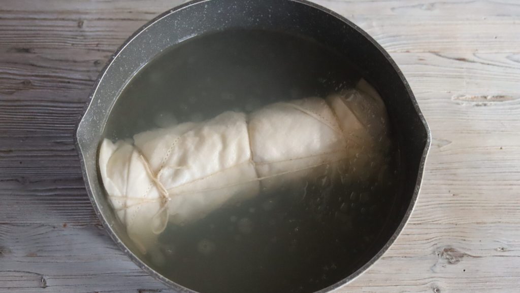 • J’ai retiré le vide d’air au cotechino, je l’ai enveloppé dans une serviette en coton et attaché avec de la ficelle de cuisine.
