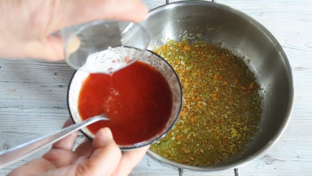 • Entre-temps, allongez avec un verre d’eau le concentré de tomate