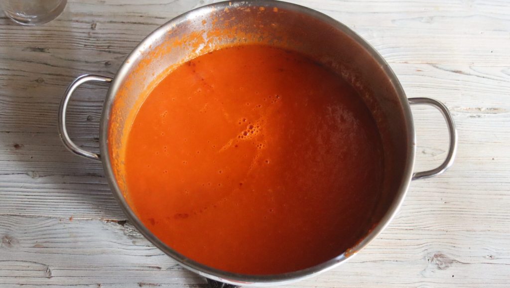 • Ajoutez les tomates pelées et avec un mixeur plongeant réduisez le tout en crème.
