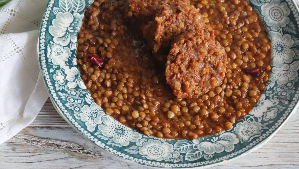 Lentilles et cotechino pas seulement pour le Nouvel An. Avec le froid de ces jours-ci, c’est vraiment agréable d’avoir un plat chaud et réconfortant comme celui-ci. C’est l’histoire d’un cadeau de Noël, précisément d’un beau cotechino artisanal préparé par un boucher charcutier d’un petit village pas trop loin de Rome. Brisons le mythe des lentilles au Nouvel An qui apportent de l’argent. Les lentilles se mangent toute l’année et sont excellentes comme tous les légumineuses. Il en existe tellement de variétés que nous pourrions en manger un type différent chaque jour. Riches en calcium, fer et protéines, elles contiennent aussi beaucoup de vitamines et une grande quantité de minéraux. Rien que pour cela, elles devraient être consommées plus fréquemment et pas seulement à la fin de l’année pour porter chance. Parmi les nombreux avantages, le plus intéressant pour les lentilles est la cuisson rapide sans trempage, ce qu’aucun autre légume n’a.