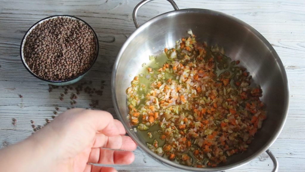 • Ajoutez les lentilles lavées deux fois et couvrez avec de l’eau, si possible chaude, ajustez le sel.