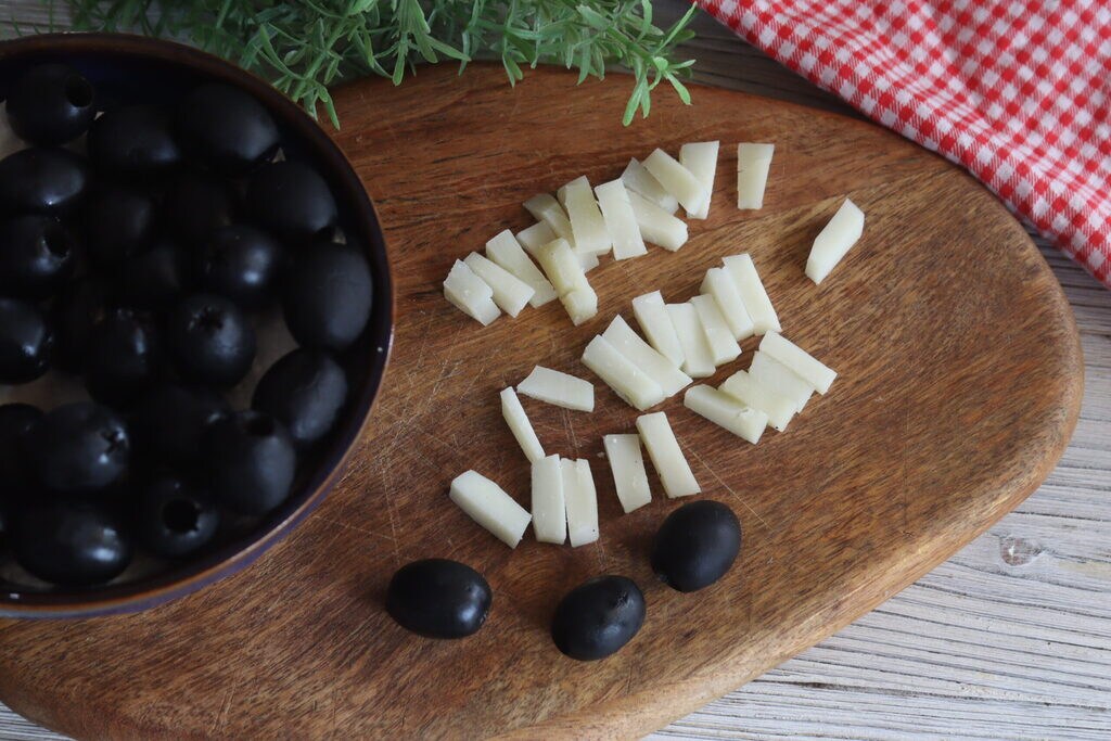 Je précise que j’achète les olives déjà dénoyautées (vous vous souvenez de ce que nous avons déjà dit il y a quelques jours ? En cuisine, il faut optimiser le temps et parfois se faire aider par la technologie), je coupe le fromage en bâtonnets, ajustez-vous avec le petit trou des olives pour insérer le fromage. Je prépare les olives farcies et je les laisse de côté.