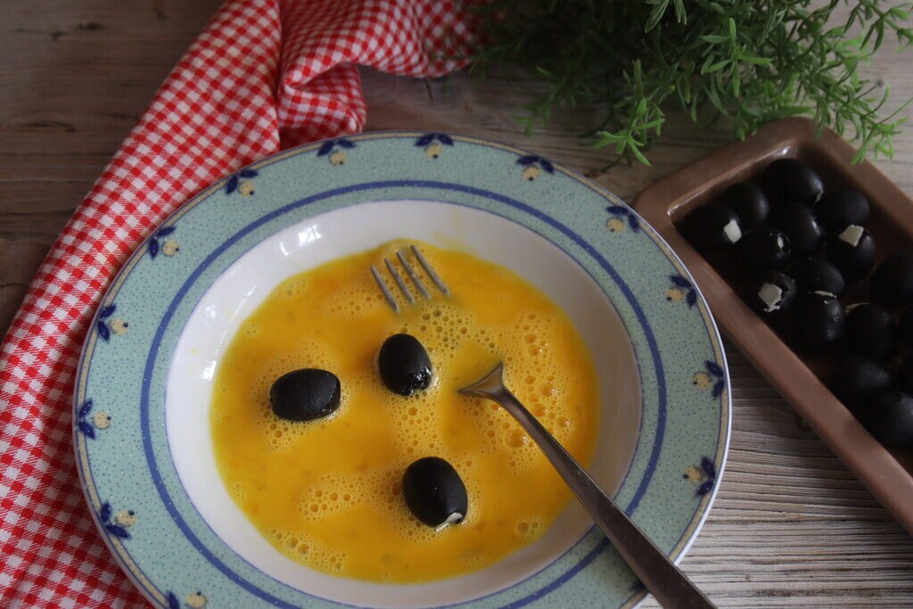 En attendant, je bats l’œuf et j’ajoute les olives, je les fais rouler quelques secondes puis