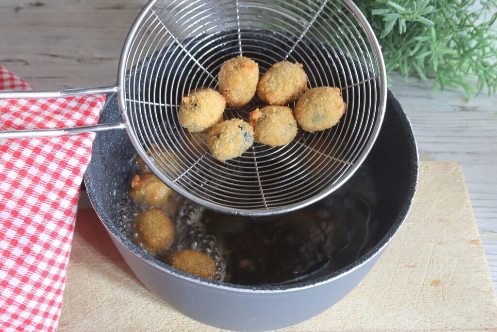 Casserole avec de l’huile d’arachide et dès qu’elle atteint la température de 170°, je mets les olives farcies et avec la louche je les retourne pour les faire dorer de tous les côtés en même temps.