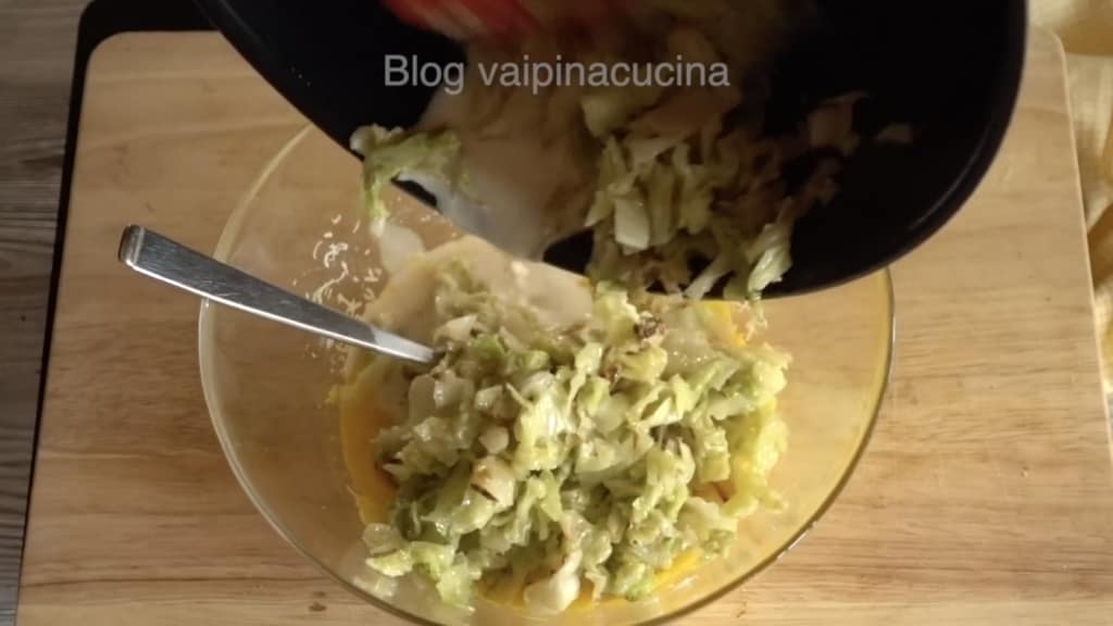 • Dès que c’est prêt, laissez légèrement refroidir le chou et ajoutez-le dans le bol avec les œufs et le fromage.