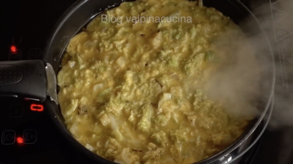 • Pendant que vous lavez et séchez le chou, mettez l’échalote à dorer dans la poêle pendant quelques minutes avec l’huile, ajoutez le chou et faites cuire pendant 10 minutes à couvert. Dans un bol, préparez les œufs battus avec le fromage, le sel et le poivre.
