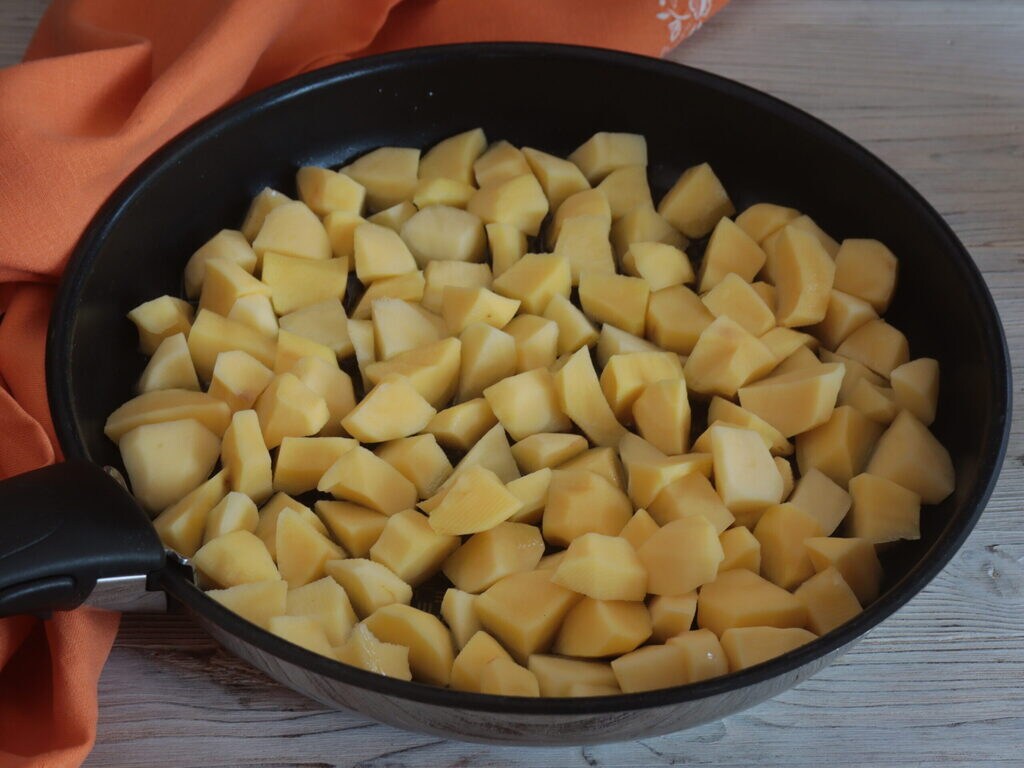 • Je lave et épluche les pommes de terre, je les coupe en dés et avec un torchon je les sèche bien.