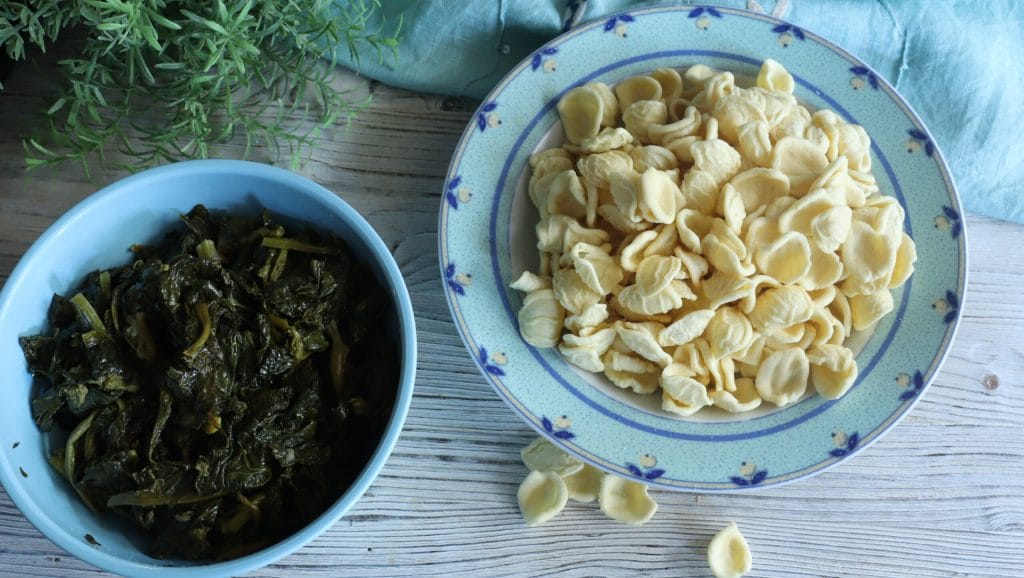 Orecchiette aux cime di rapa, un plat principal parmi tant d’autres typiques de la région des Pouilles et en particulier de la tradition culinaire de la province de Bari. Un légume unique mais avec de nombreux noms : à Rome ce sont les broccoletti, tandis qu’à Naples friarielli, en Toscane on les appelle rapini. Le navet est un légume de la même famille que le chou-fleur, le chou et les choux de Bruxelles; le navet, donc, est la racine des cime di rapa, c’est-à-dire les feuilles qui le représentent. Préparer des orecchiette à la maison n’est pas vraiment difficile, avec de la pratique on acquiert petit à petit la dextérité. Elles sont généralement préparées avec de la farine de blé dur et de la farine blanche, une pincée de sel et de l’eau ajoutée peu à peu. Encore aujourd’hui, dans presque toutes les maisons de Bari, les orecchiette sont préparées à la main.
