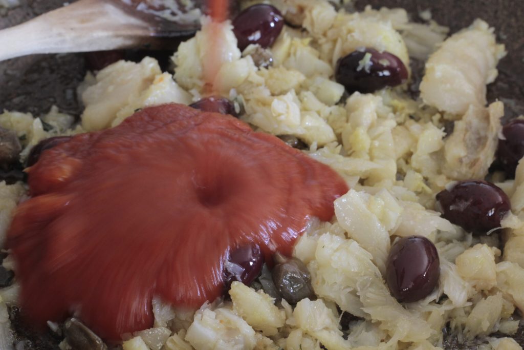 • Enlevez la peau de la morue. Bien sûr, nous parlons d’un poisson déjà prêt, dessalé et trempé à cuisiner que nous trouvons chez le poissonnier. Réduisez-le en petits morceaux et faites cuire dans une poêle avec deux cuillères à soupe d’huile d’olive et une gousse d’ail. Dix minutes ainsi, puis ajoutez les olives.