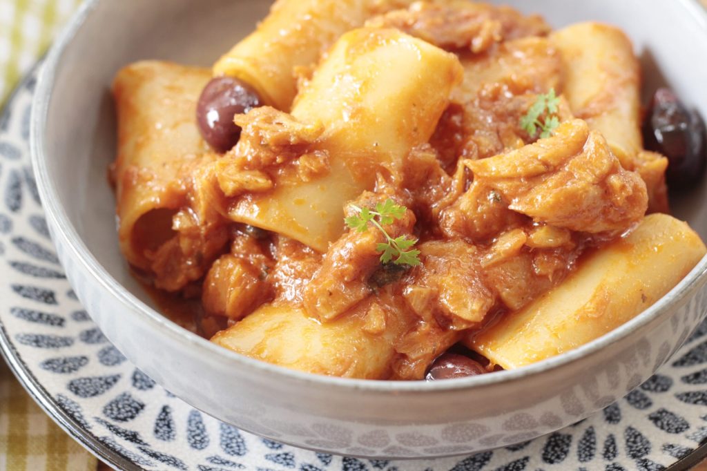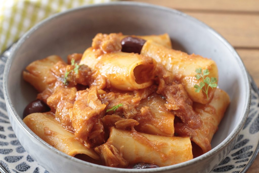 • Préparez les paccheri al dente et terminez la cuisson dans la sauce de morue. Si nécessaire, ajoutez une petite louche d’eau de cuisson des pâtes.