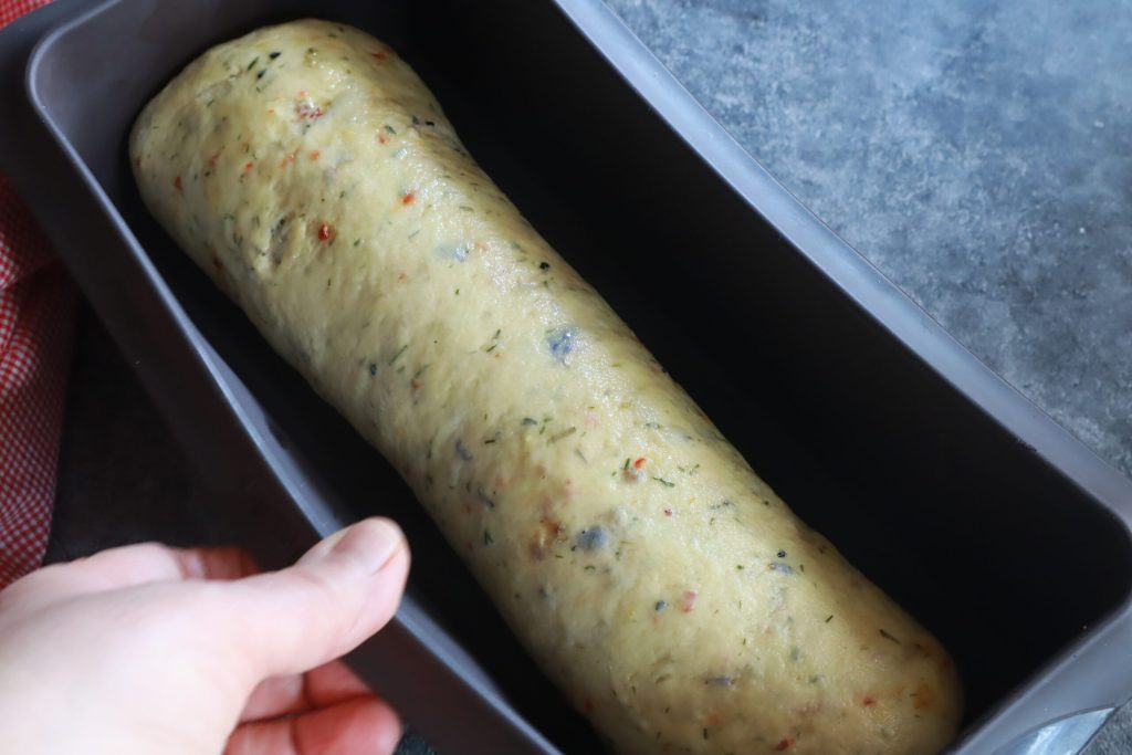 • J’étale la pâte avec le rouleau, pas trop fine, et je l’enroule. Je la mets dans le moule à pain de mie.