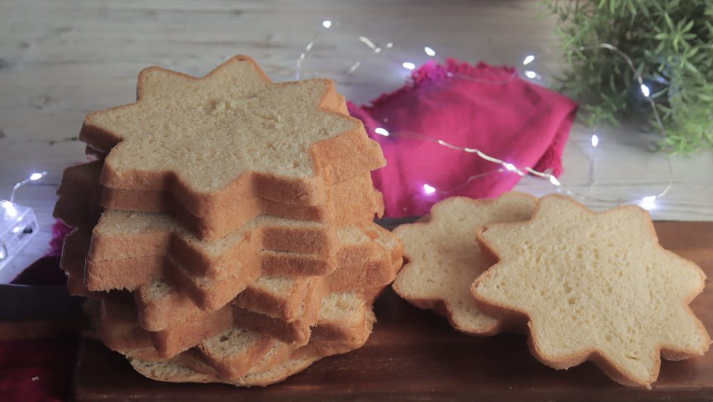 Pour préparer le pandoro gastronomique, voici comment je procède : je chauffe le lait et j’ajoute le sucre, la levure et une partie de la farine du poids total des ingrédients. Je laisse reposer 30 minutes jusqu’à ce que la levée commence. Je mets dans le robot le levain avec l’huile, l’œuf et je commence à pétrir avec le crochet. J’ajoute peu à peu la farine et enfin le sel. Quand la pâte est bien élastique et compacte, je la laisse reposer couverte pendant 2 heures dans le four (éteint bien sûr). Une fois le temps écoulé, je reprends la pâte levée, je fais quelques plis et je la mets dans le moule à pandoro. Mon pandoro gastronomique pour les fêtes a la forme d’une étoile. Je le couvre avec du film plastique et je le laisse reposer encore pendant 1 heure. Après le temps écoulé, je le fais cuire à 190° pendant 30 minutes.