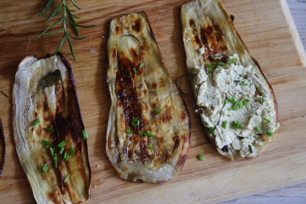 Étalez les aubergines sur une planche à découper et répartissez uniformément sur toutes les aubergines une moitié de la crème de tofu.