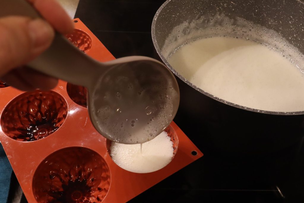 Encore chaude, j’ai réparti la panna cotta dans le moule en silicone en forme de fleur.