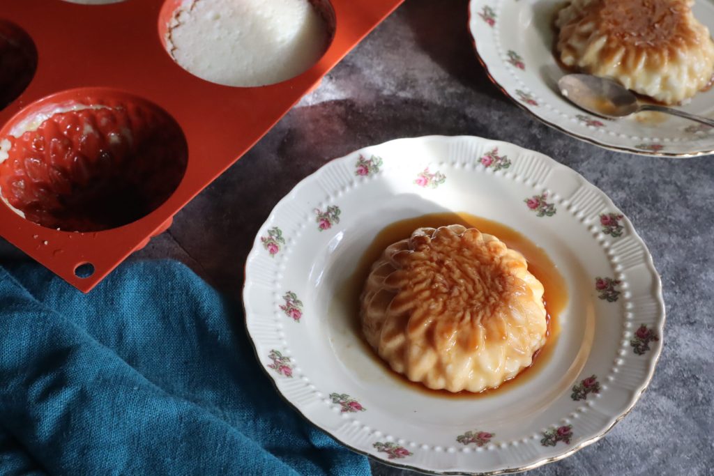 J’ai démoulé la panna cotta et je l’ai servie dans des petites assiettes avec le caramel.