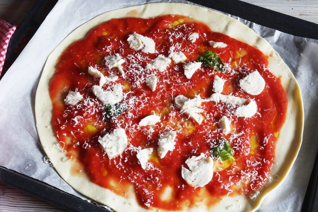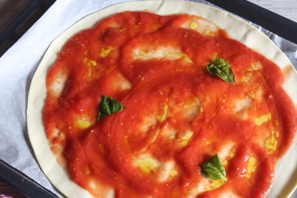 Assaisonnez la tomate avec du sel, de l’huile et du basilic et répartissez-la sur la pâte feuilletée.