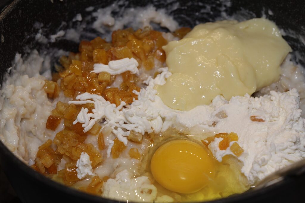 Préparez la crème pâtissière avec deux jaunes d’œufs, la farine avec le sucre et 250 ml de lait sur le lien en bleu ICI vous trouverez la recette complète. Ajoutez la crème pâtissière au reste de la pâte.