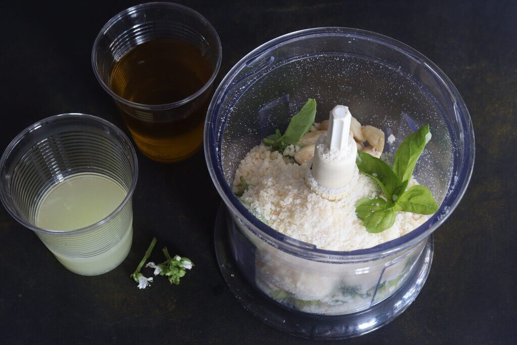 Le citron pressé et le zeste râpé, l’huile et le basilic, la menthe et l’ail, le sel avec le parmesan râpé et les amandes émondées.
