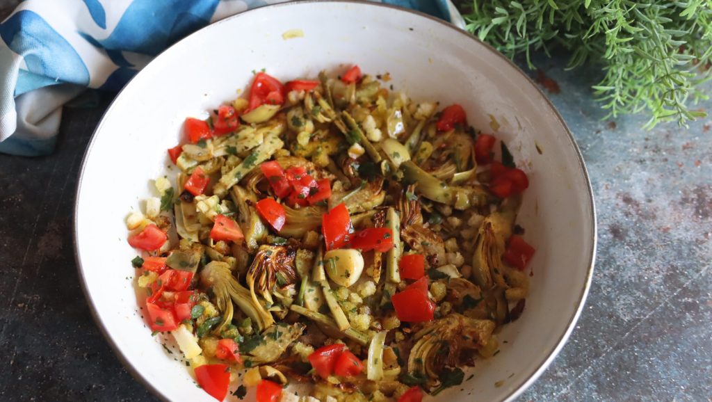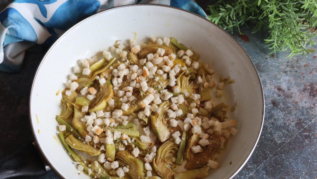 Dès que les artichauts sont tendres, cela prendra environ 8 minutes, ajoutez la chapelure et faites-la dorer avec les artichauts.