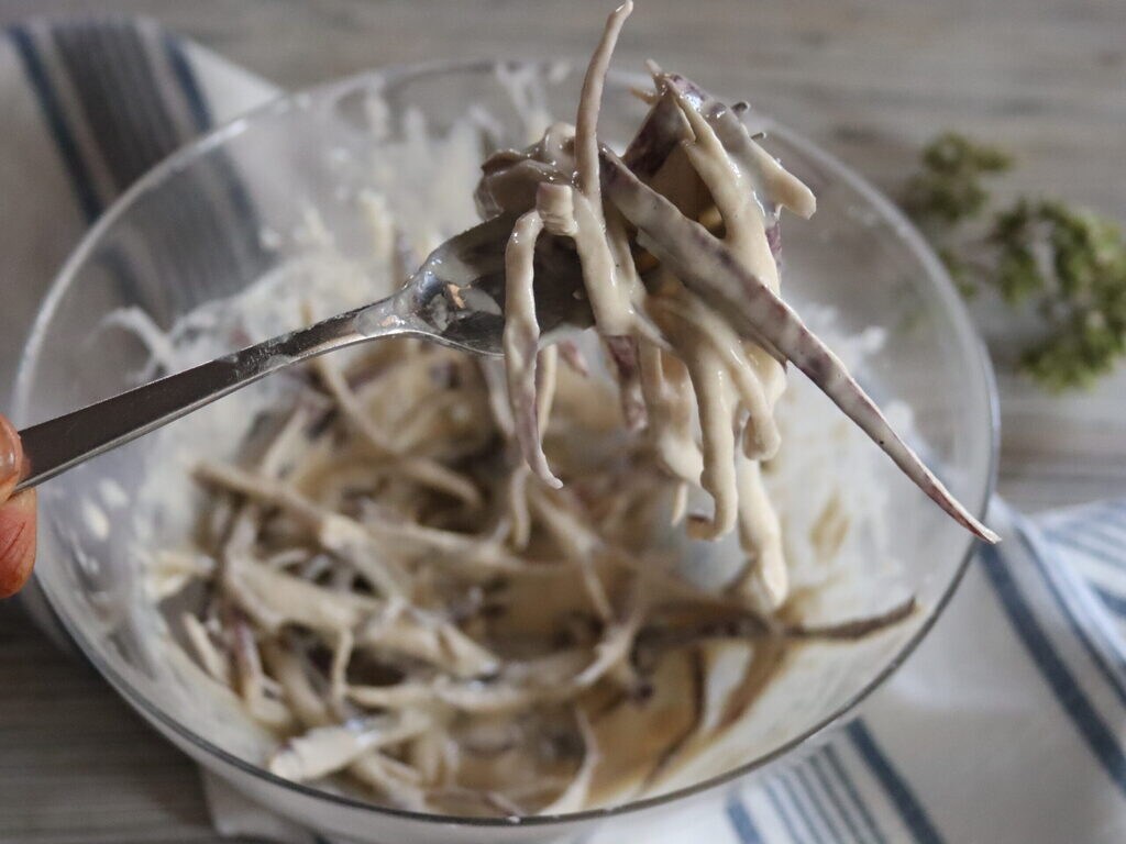 Épluchez les aubergines en vous aidant de l’économe pour les rendre très fines et réduisez-les en julienne, mettez-les dans de l’eau froide pour enlever l’amertume au moins pendant 2 heures, au bout de ce temps, séchez-les et préparez la pâte.