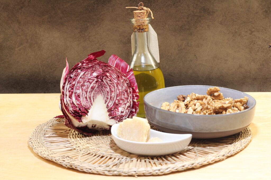 Pesto chicorée et noix, tout part de l’idée du classique pesto à la génoise, facile à faire avec le basilic, en changeant les ingrédients, nous préparons un pesto qui nous permet d’assaisonner les pâtes et plus encore. En utilisant ce que l’on a le plus à portée de main et sans jamais inventer quelque chose qui n’a pas déjà été vu. Ainsi est né le pesto de chicorée et noix, de la nécessité de se débarrasser, visiblement, d’un pied de chicorée solitaire et abandonné dans le frigo et de noix qui, après Noël, étaient restées inutilisées dans le panier. Et voici un pesto délicieux, fait donc avec de l’huile d’olive extra vierge, du sel, du poivre, de la chicorée et des noix, pour ceux qui aiment les goûts légèrement amers, vraiment extraordinaire et bénéfique.