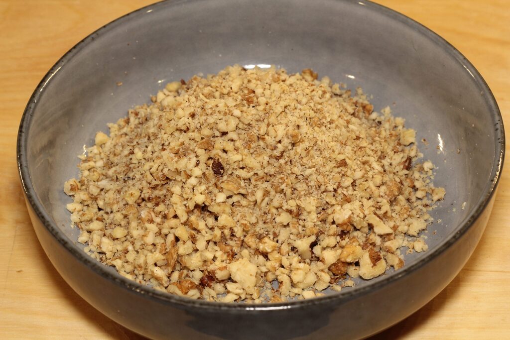 Hachez les noix grossièrement dans le hachoir, il n’est pas nécessaire de les broyer finement