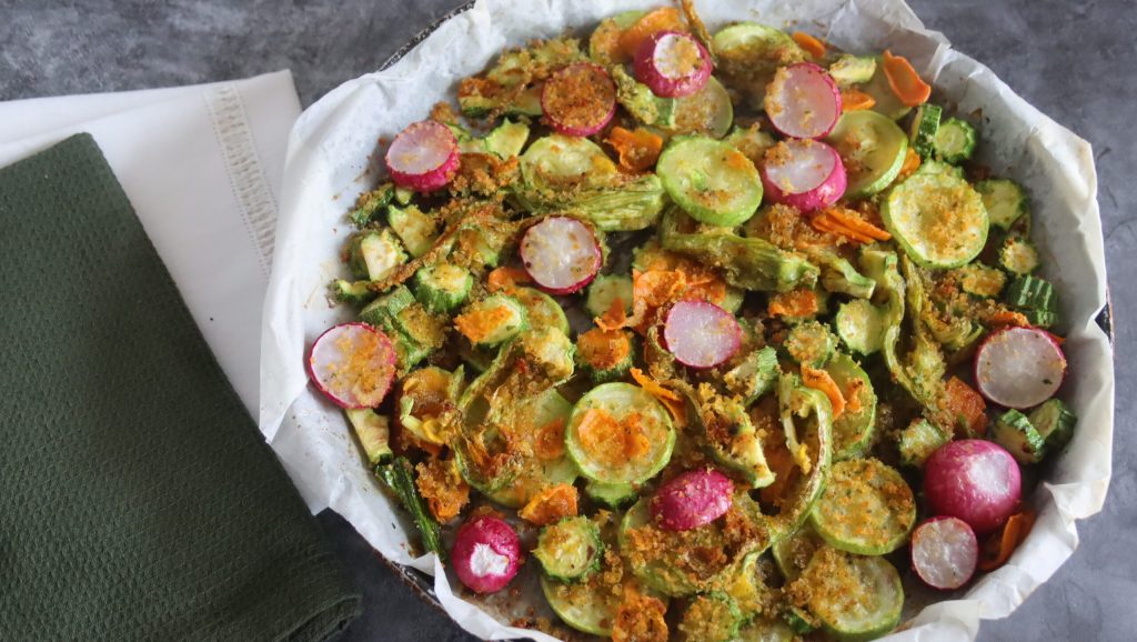 Dans le plat avec du papier sulfurisé, répartissez les légumes coupés et par-dessus la chapelure aromatisée. Si nécessaire, ajoutez encore un filet d’huile d’olive extra vierge et faites cuire au micro-ondes en mode Crisp pendant 20 minutes.