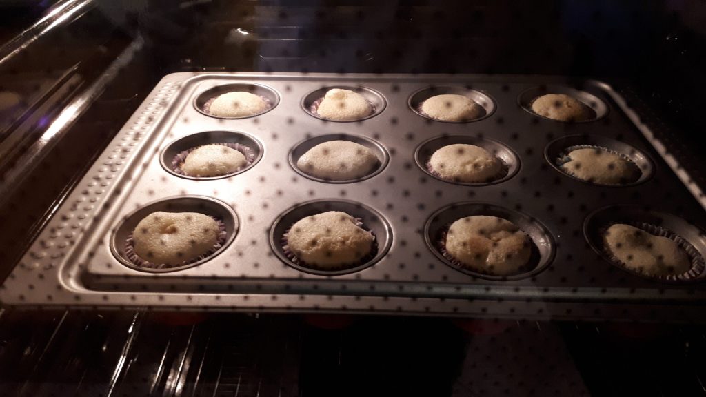 • Préparez les caissettes dans la plaque pour muffins, remplissez-les aux trois quarts avec la pâte de petits gâteaux aux agrumes aromatisés.