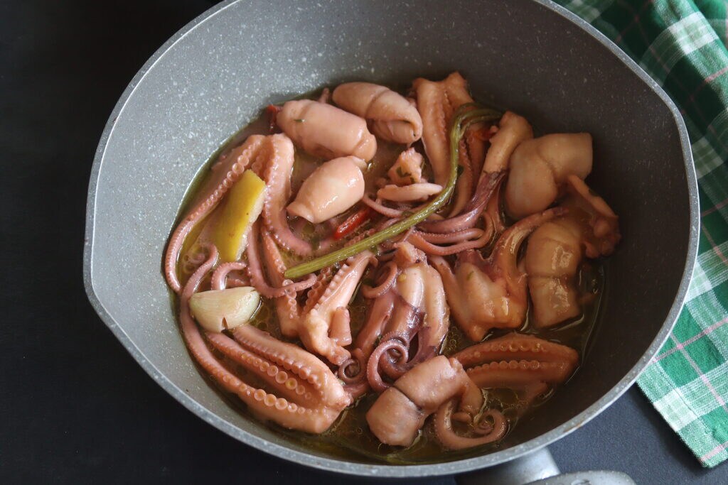 Faites dorer l’ail, à huile chaude, plongez les petits poulpes coupés en gros morceaux, malheureusement à la cuisson ils réduisent et donc vous pourriez les laisser entiers. Ajoutez le zeste de citron et laissez-le pendant toute la cuisson des petits poulpes.